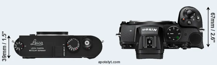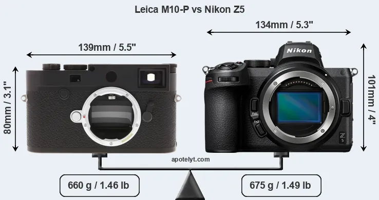The physical size and weight of the Leica M10-P and the Nikon Z5 are illustrated in the side-by-side display below. The two cameras are presented according to their relative size. Three consecutive perspectives from the front, the top, and the back are available. All width, height and depth measures are rounded to the nearest millimeter.