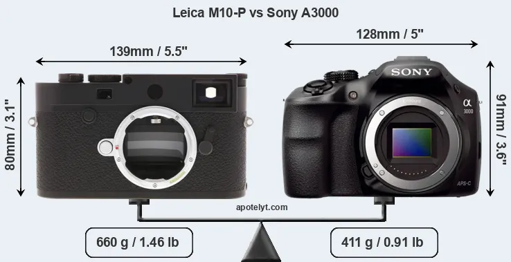 If the front view area (width x height) of the cameras is taken as an aggregate measure of their size, the Sony A3000 is somewhat larger (5 percent) than the Leica M10-P. However, the A3000 is substantially lighter (38 percent) than the M10-P. It is worth mentioning in this context that the M10-P is splash and dust resistant, while the A3000 does not feature any corresponding weather-sealing.