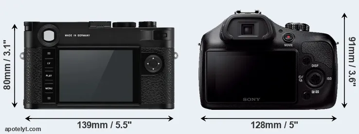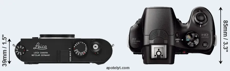 The side-by-side display below illustrates the physical size and weight of the Leica M10-P and the Sony A3000. The two cameras are presented according to their relative size. Three successive views from the front, the top, and the rear are shown. All width, height and depth dimensions are rounded to the nearest millimeter.