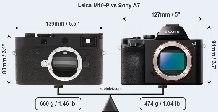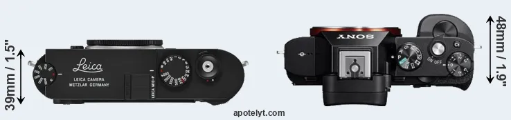 The physical size and weight of the Leica M10-P and the Sony A7 are illustrated in the side-by-side display below. The two cameras are presented according to their relative size. Three successive views from the front, the top, and the rear are shown. All width, height and depth measures are rounded to the nearest millimeter.