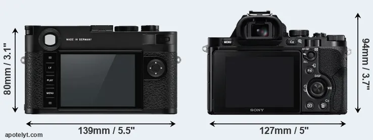 The above size and weight comparisons are to some extent incomplete since they do not consider the interchangeable lenses that both of these cameras require. Both cameras have similarly sized sensors, but DSLRs have a larger flange-to-focal plane distance than mirrorless cameras, which imposes contraints on the optical engineering process and generally leads to bigger and heavier lenses. You can compare the optics available for the two cameras in the Leica M Lens Catalog (M10-P) and the Sony FE Lens Catalog (A7).