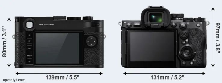 The above size and weight comparisons are to some extent incomplete since they do not consider the interchangeable lenses that both of these cameras require. Both cameras have similarly sized sensors, but DSLRs have a larger flange-to-focal plane distance than mirrorless cameras, which imposes contraints on the optical engineering process and generally leads to bigger and heavier lenses. You can compare the optics available for the two cameras in the Leica M Lens Catalog (M10-P) and the Sony FE Lens Catalog (A7R V).