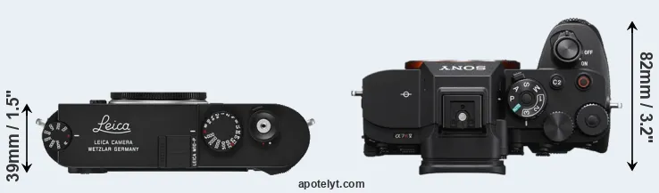 The physical size and weight of the Leica M10-P and the Sony A7R V are illustrated in the side-by-side display below. The two cameras are presented according to their relative size. Three consecutive views from the front, the top, and the rear side are shown. All width, height and depth dimensions are rounded to the nearest millimeter.