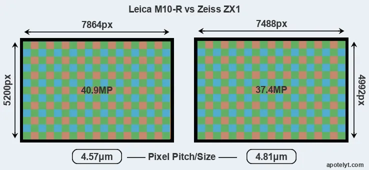 Despite having a slightly smaller sensor, the Leica M10-R offers a higher resolution of 40.9 megapixels, compared with 37.4 MP of the Zeiss ZX1. This megapixels advantage comes at the cost of a higher pixel density and a smaller size of the individual pixel (with a pixel pitch of 4.57μm versus 4.81μm for the ZX1). However, it should be noted that the M10-R is a somewhat more recent model (by 1 year and 9 months) than the ZX1, and its sensor might have benefitted from technological advances during this time that partly offset its pixel-size disadvantage. Coming back to sensor resolution, it should be mentioned that the M10-R has no anti-alias filter installed, so that it can capture all the detail its sensor resolves.