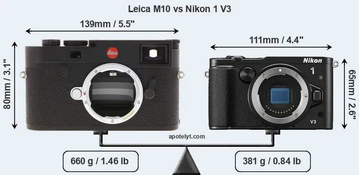 If the front view area (width x height) of the cameras is taken as an aggregate measure of their size, the Nikon 1 V3 is considerably smaller (35 percent) than the Leica M10. Moreover, the V3 is substantially lighter (42 percent) than the M10. It is worth mentioning in this context that the M10 is splash and dust resistant, while the V3 does not feature any corresponding weather-sealing.