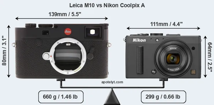 If the front view area (width x height) of the cameras is taken as an aggregate measure of their size, the Nikon Coolpix A is considerably smaller (36 percent) than the Leica M10. It is worth mentioning in this context that the M10 is splash and dust resistant, while the Coolpix A does not feature any corresponding weather-sealing.