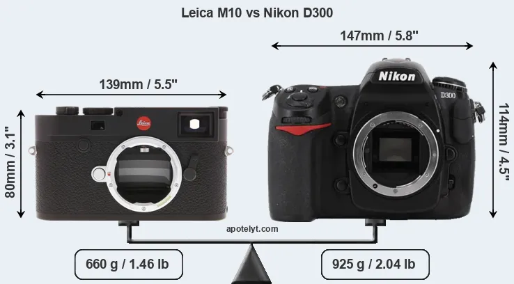An illustration of the physical size and weight of the Leica M10 and the Nikon D300 is provided in the side-by-side display below. The two cameras are presented according to their relative size. Three consecutive perspectives from the front, the top, and the back are available. All width, height and depth measures are rounded to the nearest millimeter.