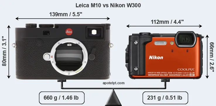 If the front view area (width x height) of the cameras is taken as an aggregate measure of their size, the Nikon W300 is considerably smaller (34 percent) than the Leica M10. In this context, it is worth noting that both cameras are splash and dust-proof and can, hence, be used in inclement weather conditions or harsh environments. More than that, the W300 is water-proof up to 30m and can, thus, be used for underwater photography.
