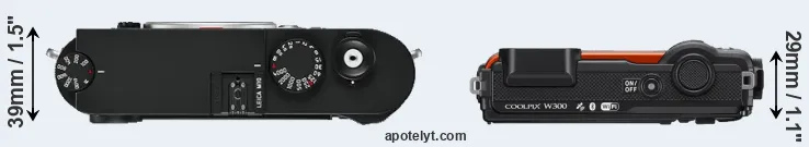 The physical size and weight of the Leica M10 and the Nikon W300 are illustrated in the side-by-side display below. The two cameras are presented according to their relative size. Three consecutive views from the front, the top, and the rear side are shown. All size dimensions are rounded to the nearest millimeter.