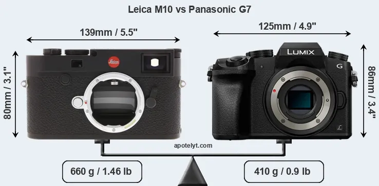 If the front view area (width x height) of the cameras is taken as an aggregate measure of their size, the Panasonic G7 is somewhat smaller (3 percent) than the Leica M10. Moreover, the G7 is substantially lighter (38 percent) than the M10. It is worth mentioning in this context that the M10 is splash and dust resistant, while the G7 does not feature any corresponding weather-sealing.