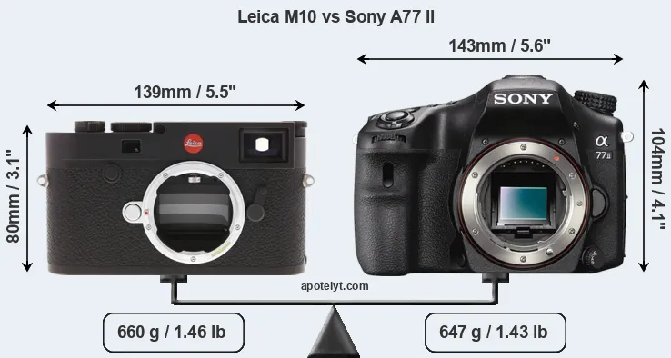 An illustration of the physical size and weight of the Leica M10 and the Sony A77 II is provided in the side-by-side display below. The two cameras are presented according to their relative size. Three successive views from the front, the top, and the rear are shown. All size dimensions are rounded to the nearest millimeter.