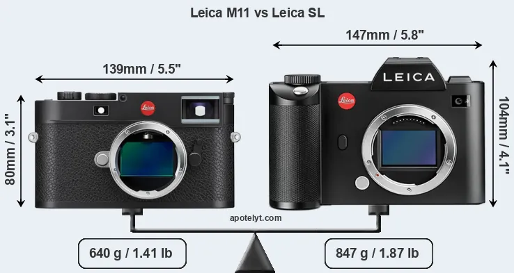 If the front view area (width x height) of the cameras is taken as an aggregate measure of their size, the Leica SL is notably larger (37 percent) than the Leica M11. Moreover, the Leica SL is markedly heavier (32 percent) than the M11. In this context, it is worth noting that both cameras are splash and dust-proof and can, hence, be used in inclement weather conditions or harsh environments.