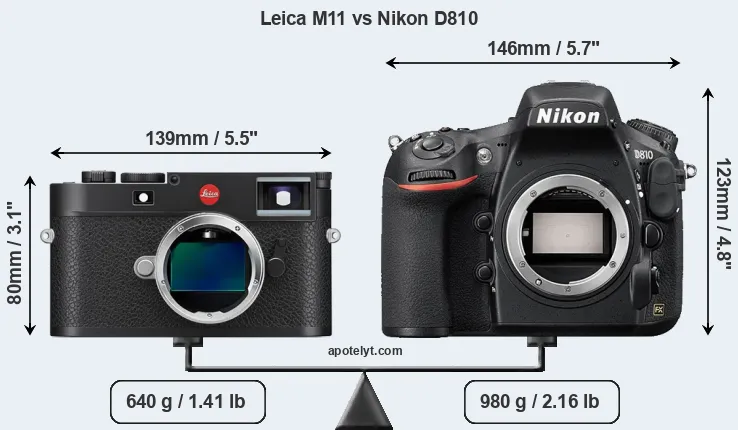 If the front view area (width x height) of the cameras is taken as an aggregate measure of their size, the Nikon D810 is considerably larger (61 percent) than the Leica M11. Moreover, the D810 is substantially heavier (53 percent) than the M11. In this context, it is worth noting that both cameras are splash and dust-proof and can, hence, be used in inclement weather conditions or harsh environments.