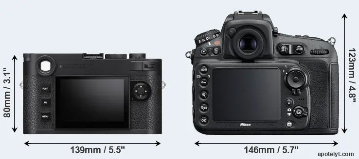 The above size and weight comparisons are to some extent incomplete since they do not consider the interchangeable lenses that both of these cameras require. Both cameras have similarly sized sensors, but DSLRs have a larger flange-to-focal plane distance than mirrorless cameras, which imposes contraints on the optical engineering process and generally leads to bigger and heavier lenses. You can compare the optics available for the two cameras in the Leica M Lens Catalog (M11) and the Nikon Lens Catalog (D810).