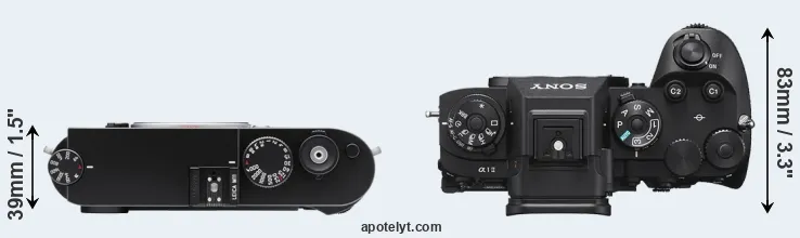 An illustration of the physical size and weight of the Leica M11 and the Sony A1 II is provided in the side-by-side display below. The two cameras are presented according to their relative size. Three consecutive perspectives from the front, the top, and the back are available. All size dimensions are rounded to the nearest millimeter.