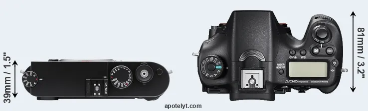 The physical size and weight of the Leica M11 and the Sony A77 II are illustrated in the side-by-side display below. The two cameras are presented according to their relative size. Three consecutive views from the front, the top, and the rear side are shown. All size dimensions are rounded to the nearest millimeter.