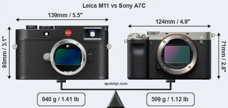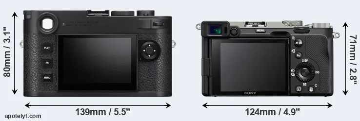 An illustration of the physical size and weight of the Leica M11 and the Sony A7C is provided in the side-by-side display below. The two cameras are presented according to their relative size. Three successive views from the front, the top, and the rear are shown. All width, height and depth dimensions are rounded to the nearest millimeter.