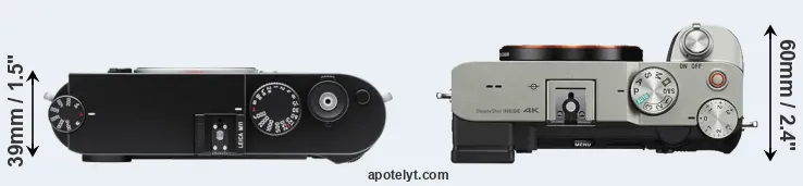 The above size and weight comparisons are to some extent incomplete since they do not consider the interchangeable lenses that both of these cameras require. Both cameras have similarly sized sensors, but DSLRs have a larger flange-to-focal plane distance than mirrorless cameras, which imposes contraints on the optical engineering process and generally leads to bigger and heavier lenses. You can compare the optics available for the two cameras in the Leica M Lens Catalog (M11) and the Sony FE Lens Catalog (A7C).