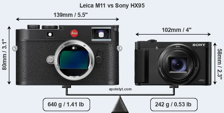 If the front view area (width x height) of the cameras is taken as an aggregate measure of their size, the Sony HX95 is considerably smaller (47 percent) than the Leica M11. It is worth mentioning in this context that the M11 is splash and dust resistant, while the HX95 does not feature any corresponding weather-sealing.