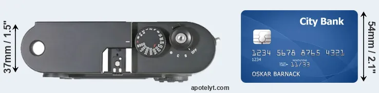 The side-by-side display below illustrates the physical size of the Leica M8 vis-à-vis a credit card. Three consecutive perspectives from the front, the top, and the back are presented. All size dimensions are rounded to the nearest millimeter.