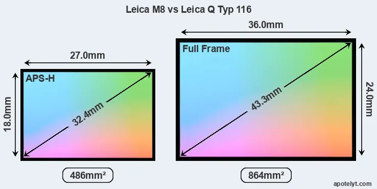 Of the two cameras under consideration, the Leica M8 features an APS-H sensor and the Leica Q Typ 116 a full frame sensor. The sensor area in the Q Typ 116 is 78 percent bigger. As a result of these sensor size differences, the cameras have a format factor of, respectively, 1.3 and 1.0. Both cameras have a native aspect ratio (sensor width to sensor height) of 3:2.