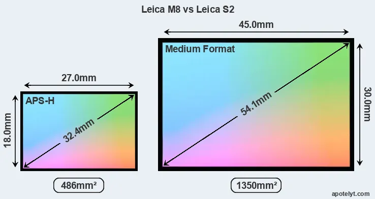 Of the two cameras under consideration, the Leica M8 features an APS-H sensor and the Leica S2 a medium format sensor. The sensor area in the S2 is 178 percent bigger. As a result of these sensor size differences, the cameras have a format factor of, respectively, 1.3 and 0.8. Both cameras have a native aspect ratio (sensor width to sensor height) of 3:2.