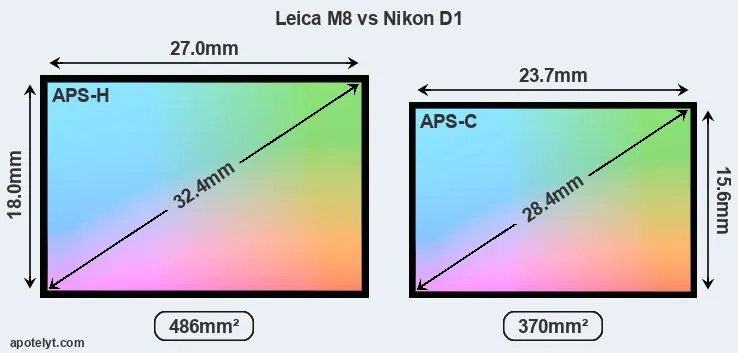 Of the two cameras under consideration, the Leica M8 features an APS-H sensor and the Nikon D1 an APS-C sensor. The sensor area in the D1 is 24 percent smaller. As a result of these sensor size differences, the cameras have a format factor of, respectively, 1.3 and 1.5. Both cameras have a native aspect ratio (sensor width to sensor height) of 3:2.