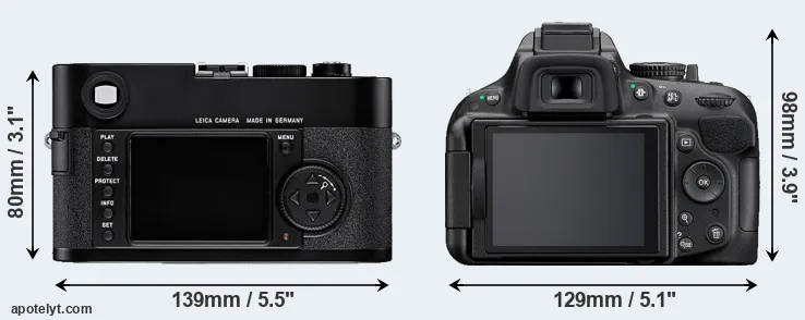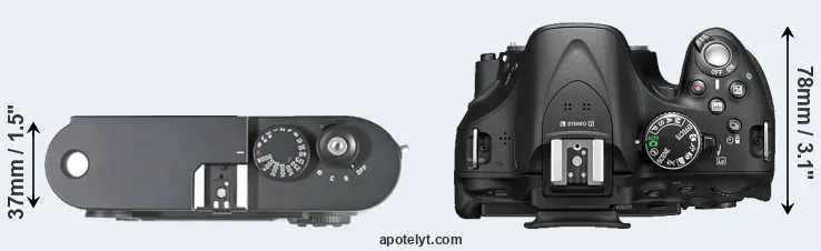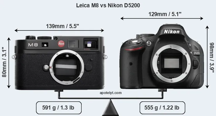 The physical size and weight of the Leica M8 and the Nikon D5200 are illustrated in the side-by-side display below. The two cameras are presented according to their relative size. Three consecutive views from the front, the top, and the rear side are shown. All width, height and depth dimensions are rounded to the nearest millimeter.