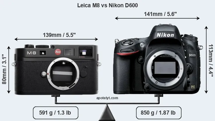 If the front view area (width x height) of the cameras is taken as an aggregate measure of their size, the Nikon D600 is considerably larger (43 percent) than the Leica M8. Moreover, the D600 is substantially heavier (44 percent) than the M8. It is noteworthy in this context that the D600 is splash and dust-proof, while the M8 does not feature any corresponding weather-sealing.