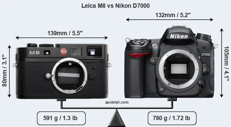 If the front view area (width x height) of the cameras is taken as an aggregate measure of their size, the Nikon D7000 is notably larger (25 percent) than the Leica M8. Moreover, the D7000 is markedly heavier (32 percent) than the M8. It is noteworthy in this context that the D7000 is splash and dust-proof, while the M8 does not feature any corresponding weather-sealing.