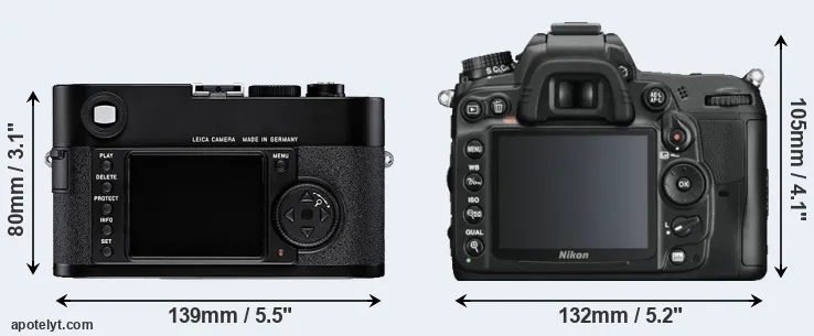 The physical size and weight of the Leica M8 and the Nikon D7000 are illustrated in the side-by-side display below. The two cameras are presented according to their relative size. Three successive views from the front, the top, and the rear are shown. All width, height and depth measures are rounded to the nearest millimeter.