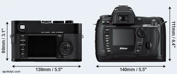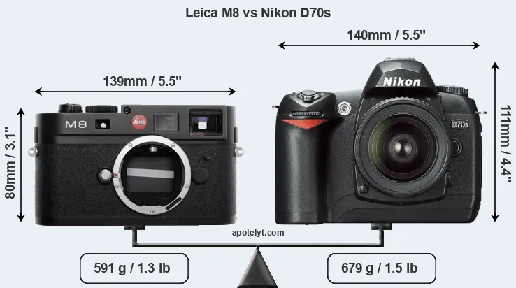 The side-by-side display below illustrates the physical size and weight of the Leica M8 and the Nikon D70s. The two cameras are presented according to their relative size. Three consecutive views from the front, the top, and the rear side are shown. All width, height and depth measures are rounded to the nearest millimeter.