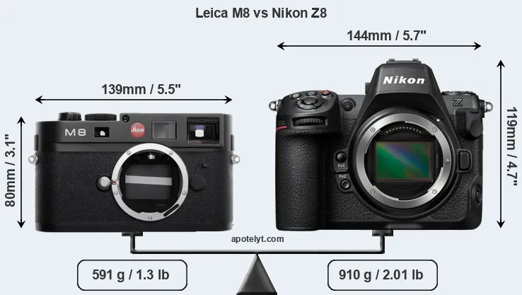 If the front view area (width x height) of the cameras is taken as an aggregate measure of their size, the Nikon Z8 is considerably larger (54 percent) than the Leica M8. Moreover, the Z8 is substantially heavier (54 percent) than the M8. It is noteworthy in this context that the Z8 is splash and dust-proof, while the M8 does not feature any corresponding weather-sealing.