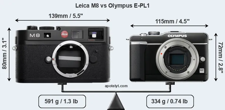 An illustration of the physical size and weight of the Leica M8 and the Olympus E-PL1 is provided in the side-by-side display below. The two cameras are presented according to their relative size. Three consecutive perspectives from the front, the top, and the back are available. All size dimensions are rounded to the nearest millimeter.