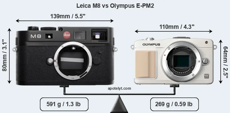 If the front view area (width x height) of the cameras is taken as an aggregate measure of their size, the Olympus E-PM2 is considerably smaller (37 percent) than the Leica M8. Moreover, the E-PM2 is substantially lighter (54 percent) than the M8. In this context, it is worth noting that neither the M8 nor the E-PM2 are weather-sealed.