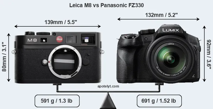 The above size and weight comparisons are to some extent incomplete and possibly misleading, as the FZ330 has a lens built in, whereas the M8 is an interchangeable lens camera that requires a separate lens. Attaching the latter will add extra weight and bulk to the setup. You can compare the optics available for the M8 and their specifications in the Leica M Lens Catalog.