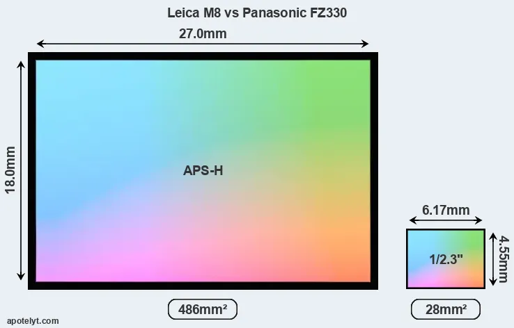 Of the two cameras under consideration, the Leica M8 features an APS-H sensor and the Panasonic FZ330 a 1/2.3-inch sensor. The sensor area in the FZ330 is 94 percent smaller. As a result of these sensor size differences, the cameras have a format factor of, respectively, 1.3 and 5.6. The sensor in the M8 has a native 3:2 aspect ratio, while the one in the FZ330 offers a 4:3 aspect.
