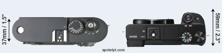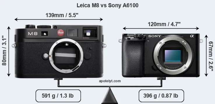 An illustration of the physical size and weight of the Leica M8 and the Sony A6100 is provided in the side-by-side display below. The two cameras are presented according to their relative size. Three consecutive perspectives from the front, the top, and the back are available. All width, height and depth measures are rounded to the nearest millimeter.
