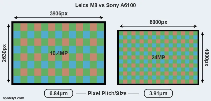 Despite having a smaller sensor, the A6100 offers a higher resolution of 24 megapixels, compared with 10.4 MP of the M8. This megapixels advantage comes at the cost of a higher pixel density and a smaller size of the individual pixel (with a pixel pitch of 3.91μm versus 6.84μm for the M8). However, it should be noted that the A6100 is much more recent (by 12 years and 11 months) than the M8, and its sensor will have benefitted from technological advances during this time that make it possible to gather light more efficiently. Coming back to sensor resolution, it should be mentioned that the M8 has no anti-alias filter installed, so that it can capture all the detail its sensor resolves.