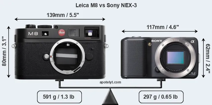 If the front view area (width x height) of the cameras is taken as an aggregate measure of their size, the Sony NEX-3 is considerably smaller (35 percent) than the Leica M8. Moreover, the NEX-3 is substantially lighter (50 percent) than the M8. In this context, it is worth noting that neither the M8 nor the NEX-3 are weather-sealed.