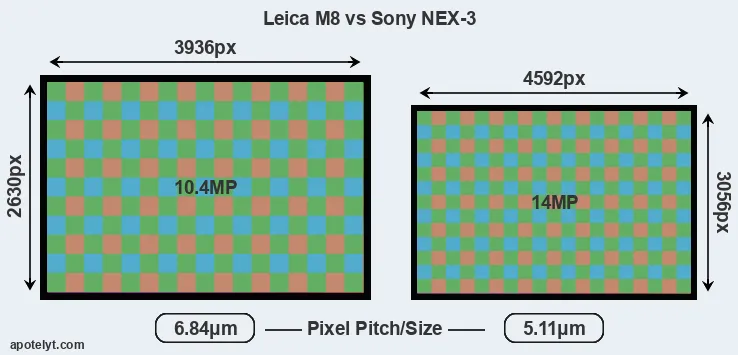 Despite having a smaller sensor, the NEX-3 offers a higher resolution of 14 megapixels, compared with 10.4 MP of the M8. This megapixels advantage comes at the cost of a higher pixel density and a smaller size of the individual pixel (with a pixel pitch of 5.11μm versus 6.84μm for the M8). However, it should be noted that the NEX-3 is much more recent (by 3 years and 7 months) than the M8, and its sensor will have benefitted from technological advances during this time that make it possible to gather light more efficiently. Coming back to sensor resolution, it should be mentioned that the M8 has no anti-alias filter installed, so that it can capture all the detail its sensor resolves.