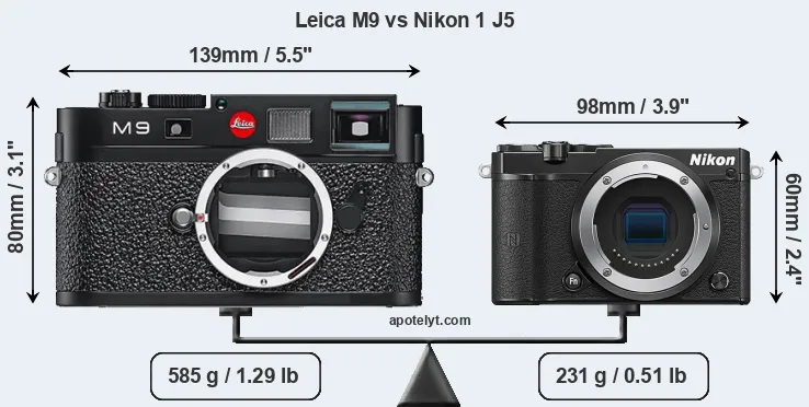 If the front view area (width x height) of the cameras is taken as an aggregate measure of their size, the Nikon 1 J5 is considerably smaller (47 percent) than the Leica M9. Moreover, the J5 is substantially lighter (61 percent) than the M9. In this context, it is worth noting that neither the M9 nor the J5 are weather-sealed.