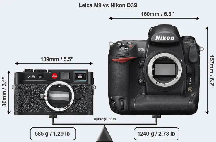If the front view area (width x height) of the cameras is taken as an aggregate measure of their size, the Nikon D3S is considerably larger (126 percent) than the Leica M9. Moreover, the D3S is substantially heavier (112 percent) than the M9. It is noteworthy in this context that the D3S is splash and dust-proof, while the M9 does not feature any corresponding weather-sealing.