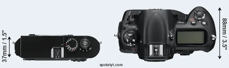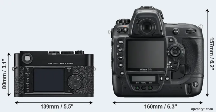 An illustration of the physical size and weight of the Leica M9 and the Nikon D3S is provided in the side-by-side display below. The two cameras are presented according to their relative size. Three consecutive perspectives from the front, the top, and the back are available. All width, height and depth dimensions are rounded to the nearest millimeter.