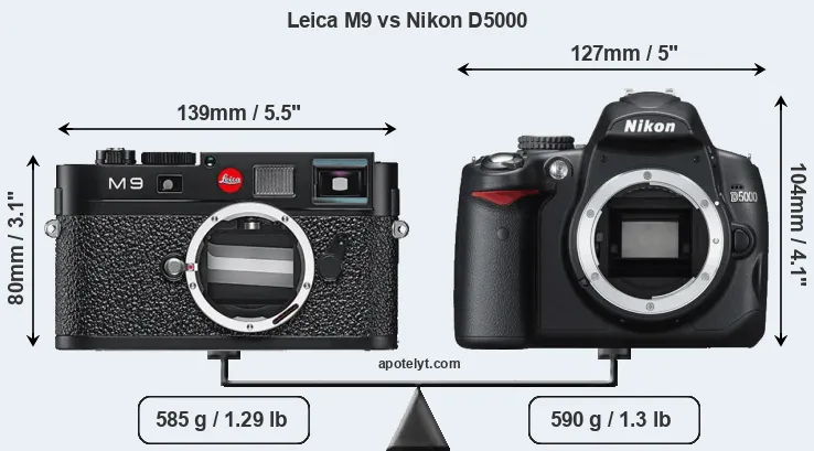 If the front view area (width x height) of the cameras is taken as an aggregate measure of their size, the Nikon D5000 is notably larger (19 percent) than the Leica M9. Moreover, the D5000 is slightly heavier (1 percent) than the M9. In this context, it is worth noting that neither the M9 nor the D5000 are weather-sealed.