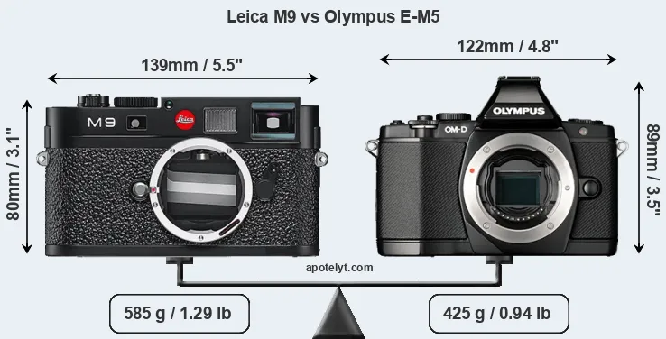If the front view area (width x height) of the cameras is taken as an aggregate measure of their size, the Olympus E-M5 is somewhat smaller (2 percent) than the Leica M9. Moreover, the E-M5 is markedly lighter (27 percent) than the M9. It is noteworthy in this context that the E-M5 is splash and dust-proof, while the M9 does not feature any corresponding weather-sealing.