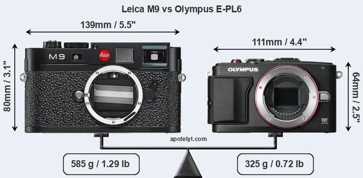 If the front view area (width x height) of the cameras is taken as an aggregate measure of their size, the Olympus E-PL6 is considerably smaller (36 percent) than the Leica M9. Moreover, the E-PL6 is substantially lighter (44 percent) than the M9. In this context, it is worth noting that neither the M9 nor the E-PL6 are weather-sealed.