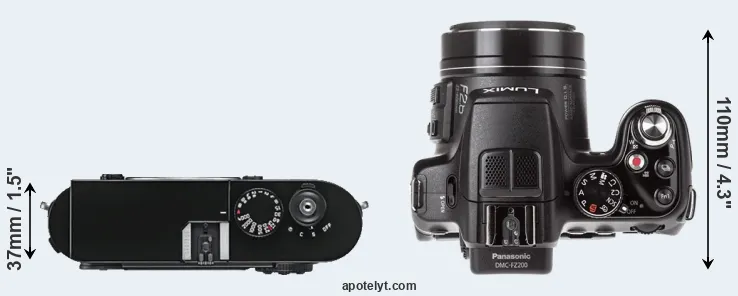 The side-by-side display below illustrates the physical size and weight of the Leica M9 and the Panasonic FZ200. The two cameras are presented according to their relative size. Three consecutive views from the front, the top, and the rear side are shown. All width, height and depth dimensions are rounded to the nearest millimeter.