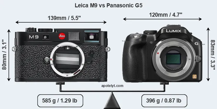 An illustration of the physical size and weight of the Leica M9 and the Panasonic G5 is provided in the side-by-side display below. The two cameras are presented according to their relative size. Three consecutive views from the front, the top, and the rear side are shown. All width, height and depth dimensions are rounded to the nearest millimeter.