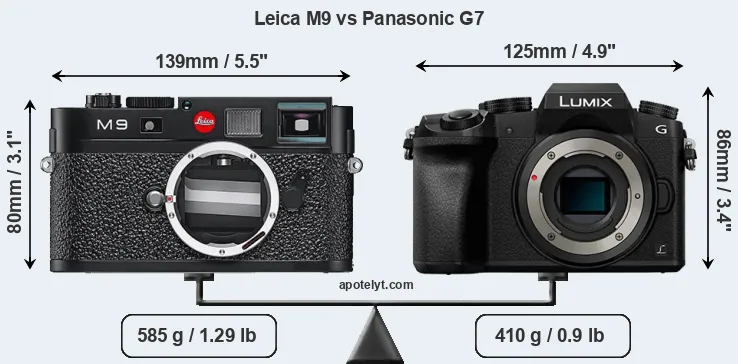 If the front view area (width x height) of the cameras is taken as an aggregate measure of their size, the Panasonic G7 is somewhat smaller (3 percent) than the Leica M9. Moreover, the G7 is markedly lighter (30 percent) than the M9. In this context, it is worth noting that neither the M9 nor the G7 are weather-sealed.